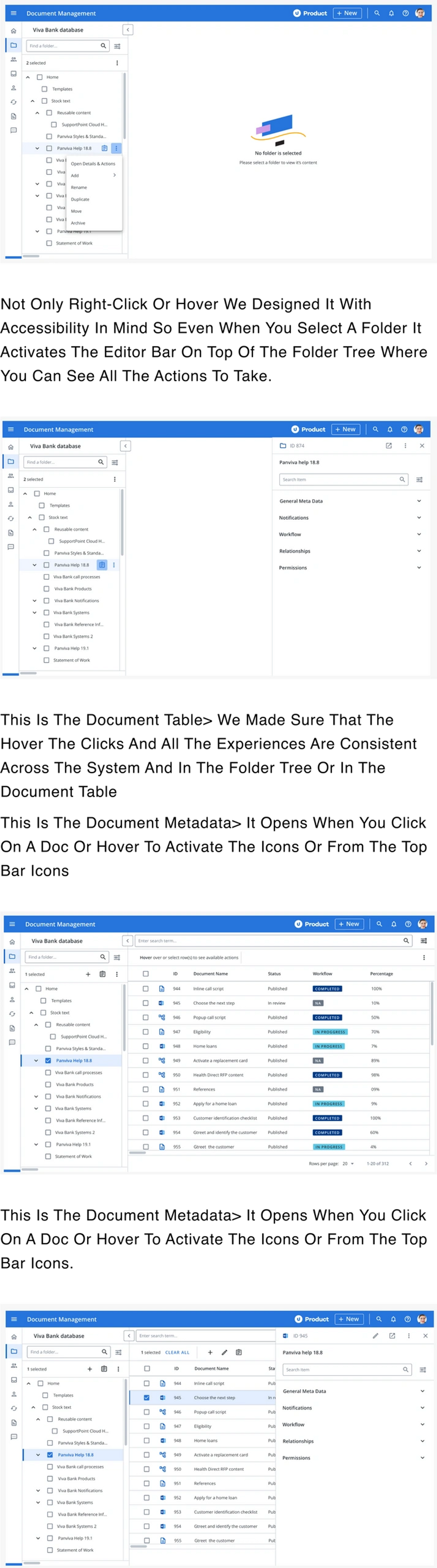 When users first land on the page, no folder is selected by default, leaving the right-hand side of the screen nearly empty. This design allows users to focus on their desired actions. When they open a folder, it’s cached so that users see the last folder they accessed during their previous session. Additionally, users can right-click on a folder or hover over it to open the metadata panel for that folder.